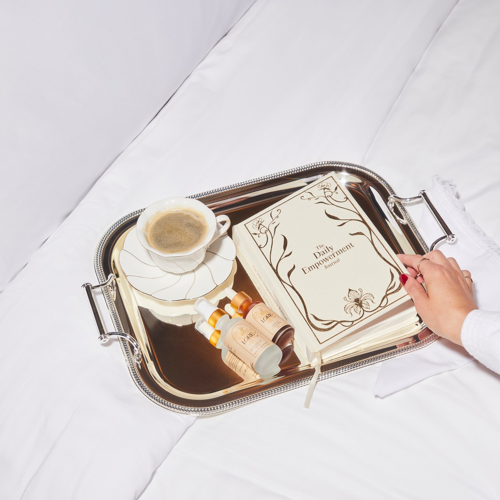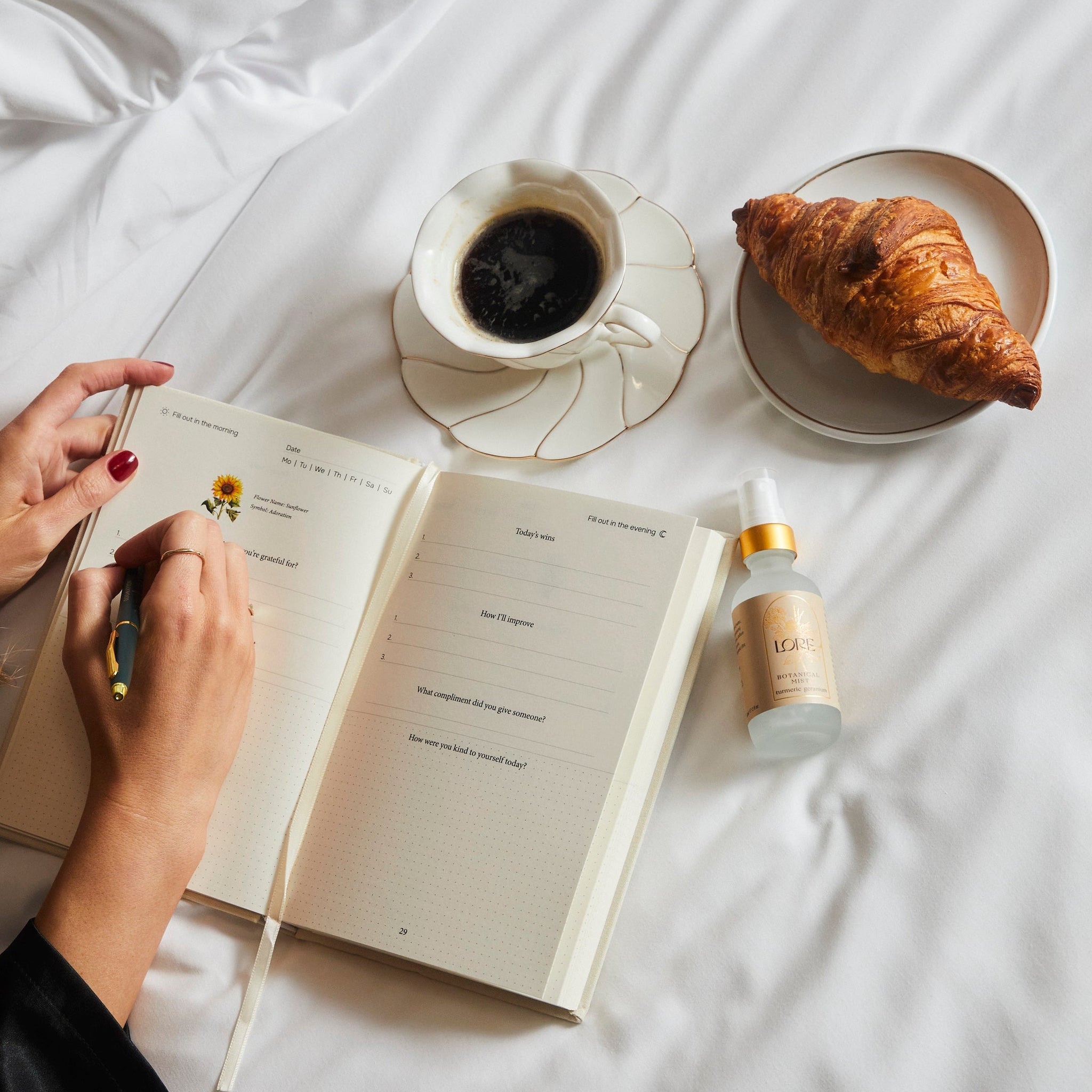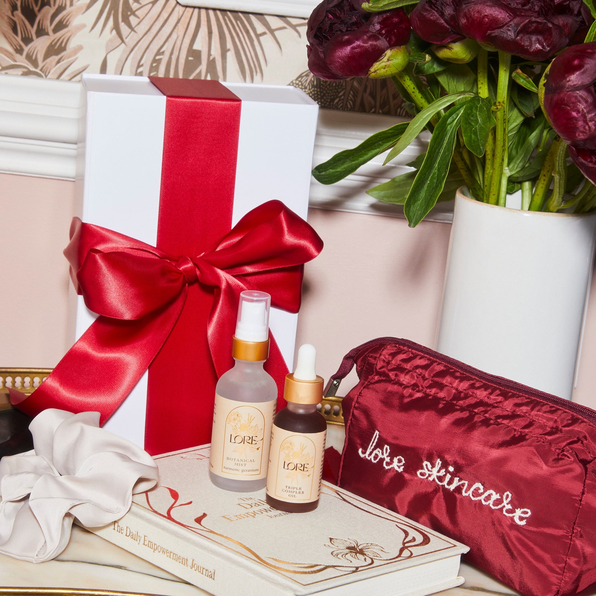 Triple Complex Oil - a lightweight, nutrient-rich face oil that soothes inflammation and restores the skin’s natural radiance. Botanical Mist (Travel Size) - alcohol-free, plant-based hydrating mist to refresh, calm, and balance the complexion. Custom Embroidered Cosmetic Bag - a timeless bag designed exclusively for Lore, perfect for home or travel. The Daily Empowerment Journal - a guided journal to reflect, reset, and cultivate self-connection through thoughtful prompts. Satin Scrunchy - gentle on hair for your AM/PM routines.